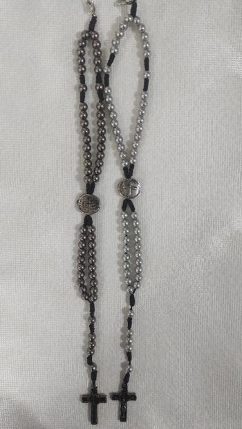 Tercinho de pulso pérola chumbo medalha e cruz duas cruzes